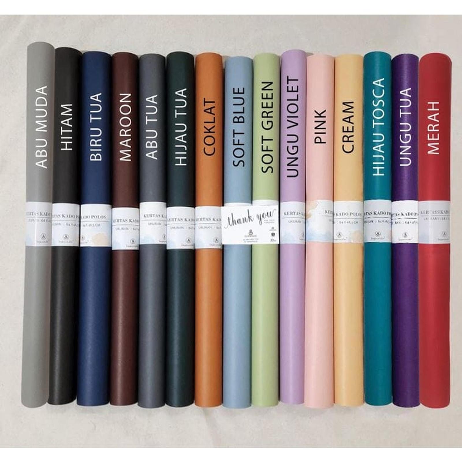 KERTAS KADO POLOS ukuran 64 x 48.5 cm Ketebalan 80 gram Bahan Doff/tidak mengkilap, Warna satu sisi bagian belakang warna putih 1 pc berisi 1 lembar Warna lengkap harap cantumkan pada keterangan